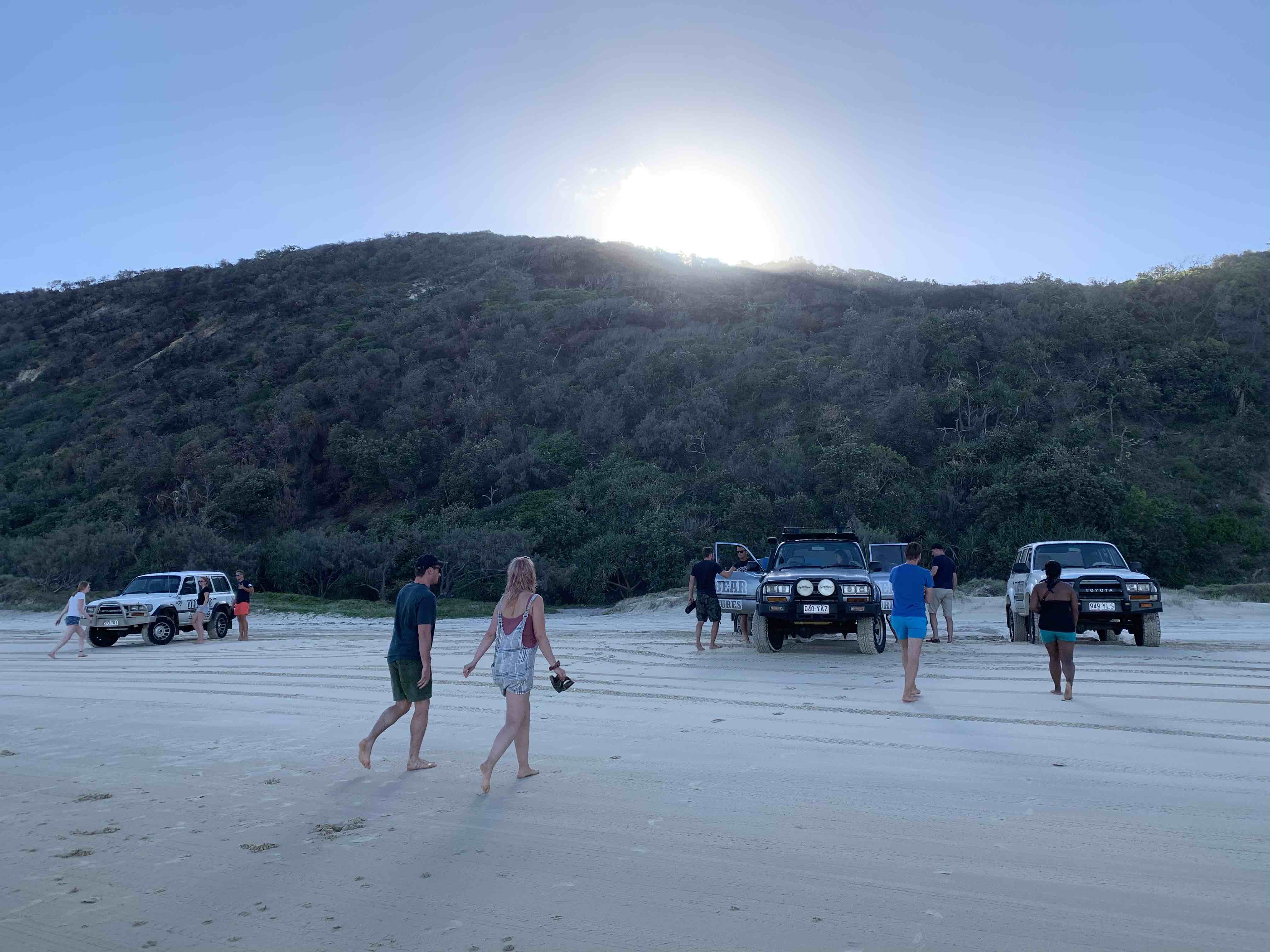 Unser Guide während der Tour war super und hat uns viel über die Kultur der Aborigines erzählt, wir konnten versuchen Didgeridoos zu spielen, Boomerangs zu werfen und er hat uns gezeigt, wie wir uns am besten durch die sehr flache Eli Creek trieben lassen können. Der beste Part des Ausflugs: es gab 3 Wagen und zwei davon mussten von uns gefahren werden. Es konnte sich also jeder, der wollte, einmal austoben und über den Strand und die Pisten im Inneren der Insel fahren. Der Weg am Strand war dabei noch ganz entspannt, im Inland waren die Wege teilweise aber schwierig mit vielen Löchern und sandigen Abschnitten. Es ist aber nur einmal ein Wagen steckengeblieben im Sand, ansonsten wurde es teilweise nur sehr rüpelig und wir wurden etwas durch den Wagen geworfen. 🙂