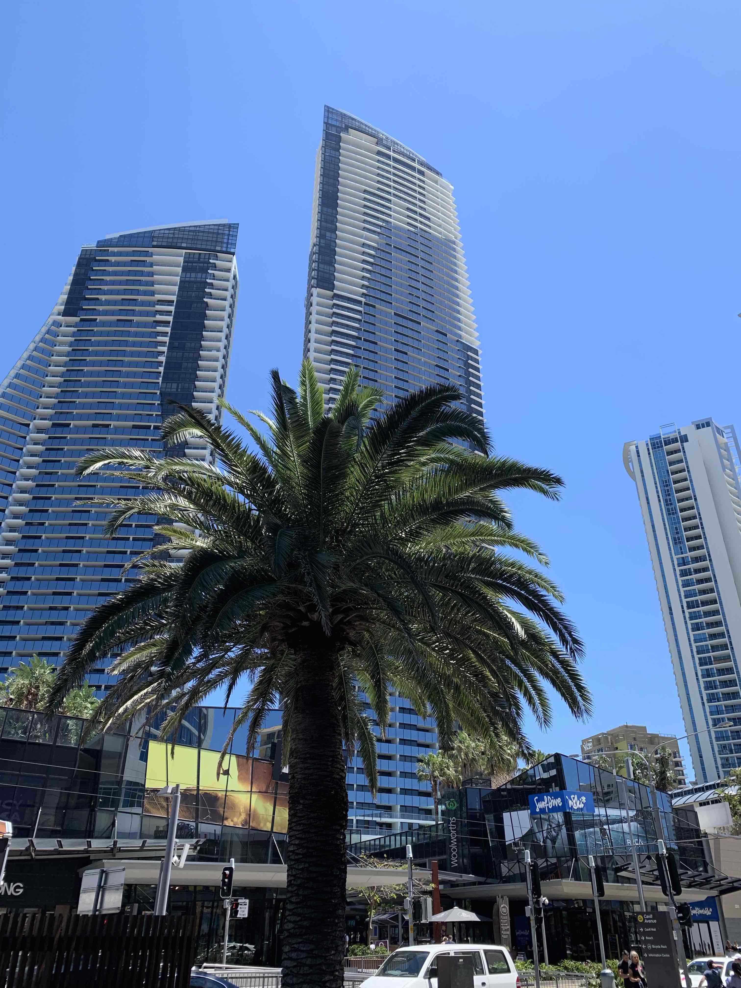 Als wir uns den Orten näherten, kam es mir so vor, als wären wir auf einmal in Miami und nicht mehr in Australien. Je näher wir zum Strand kamen, desto mehr kleine Kanäle gab es, an denen sich Villen aneinanderreihten, während im Hintergrund einige Hochhäuser zu sehen waren. Genau dort zog es uns hin, denn dort liegt der Strand. Nachdem es bestimmt eine halbe Stunde gedauert hat, bis wir einen Parkplatz gefunden haben, der nicht $10 die Stunde kostet und noch freie Plätze hat, haben wir uns auf den Weg zum Wasser gemacht und sind gleich baden gegangen. Das Wasser hier war zwar immer noch kühl, aber deutlich wärmer als noch in der Nähe von Sydney und es war eine willkommene Abkühlung von der brennenden Sonne. Der Strand schien zu beiden Seiten endlos lang zu sein, eine Promenade führt die ganze Länge entlang und dahinter gibt es eine Vielzahl an Restaurants und Geschäften. Im Gegensatz zu den anderen Orten in denen wir bisher waren, wirkt Surfers Paradise gänzlich amerikanisch – alles ist größer und es gibt hier nicht mehr die kleinen Boutiquen wie z.B. in Port Macquarie oder Byron Bay. Man könnte eigentlich auch meinen, dass die vielen Hochhäuser, die direkt am Strand in die Höhe schießen, befremdlich sind, aber irgendwie hat das seinen eigenen Charme und der Ort wirkt ziemlich cool.