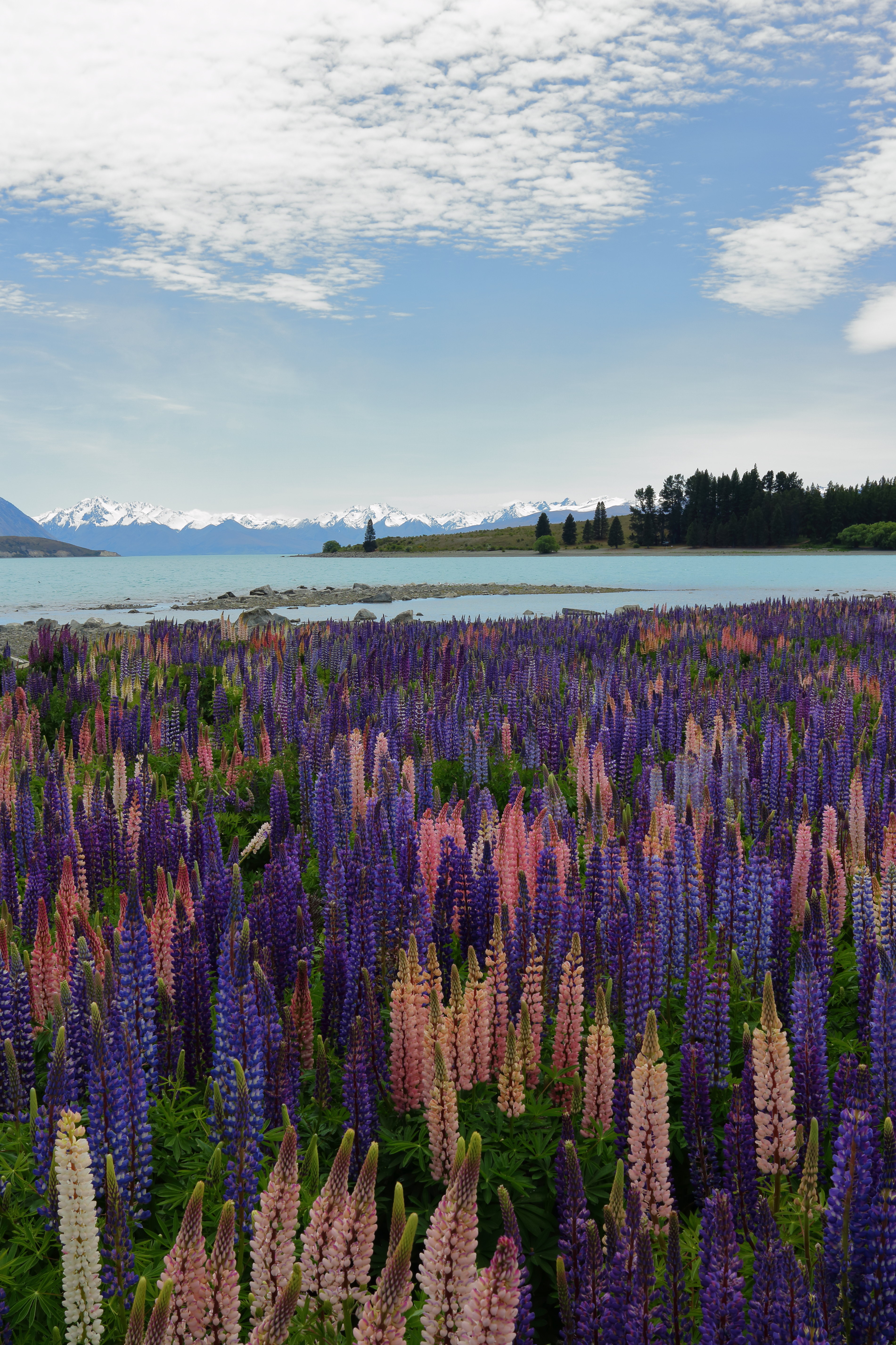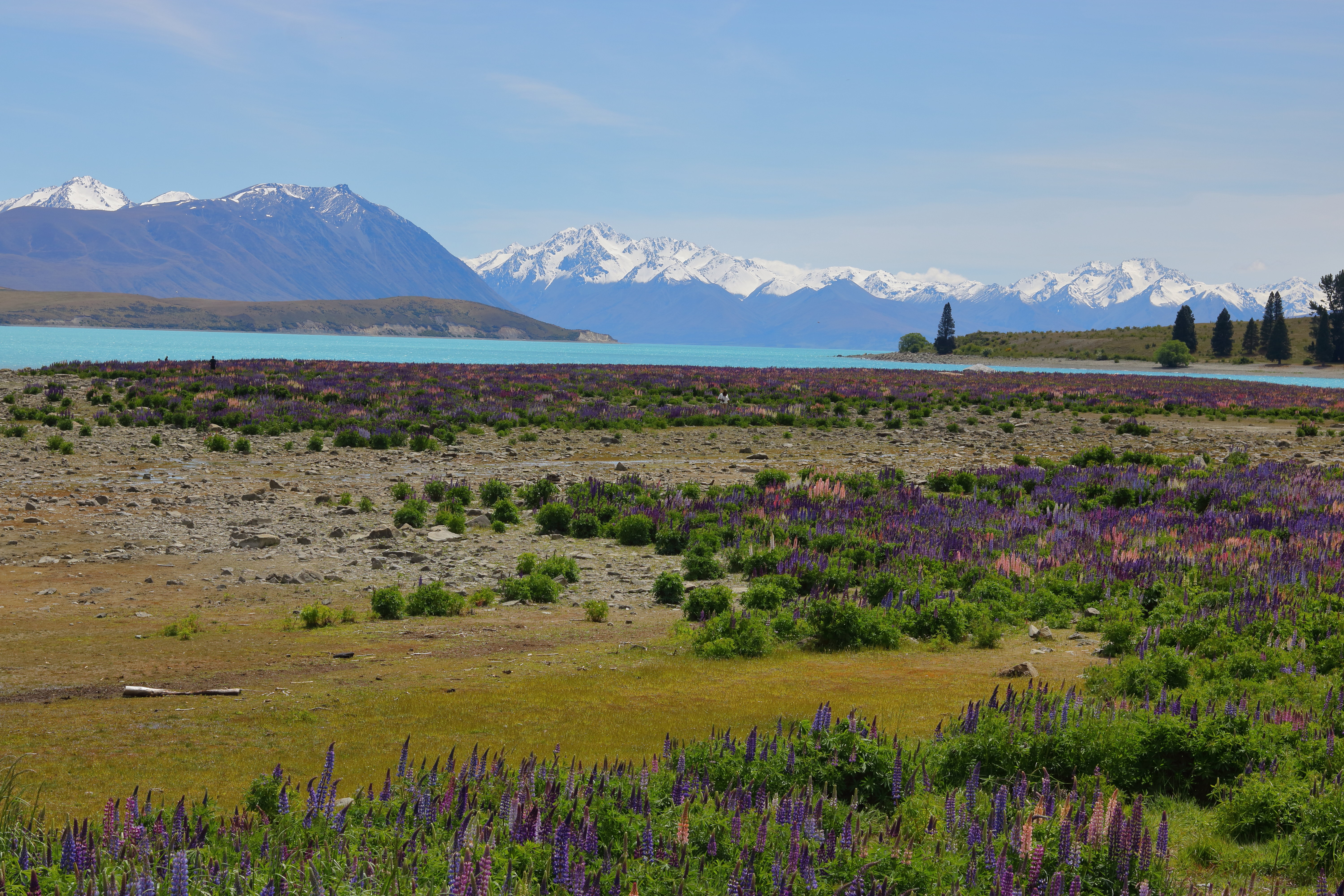 Danach ging es für uns schon in Richtung Süden zum Lake Tekapo. Wir haben unsere Zeit in Neuseeland extra in den Frühling-Sommer gelegt, damit es schon etwas wärmer wird, aber das Beste an unserer Reisezeit war die anstehende Blütezeit. Die Region um den Lake Tekapo ist bekannt für die riesigen Lupinenfelder, die im November blühen und wir haben das perfekt abgepasst. Das Wetter hat uns am See auch noch verwöhnt, wir hatten viel Sonnenschein und sind durch die Blütenfelder gegangen. Die Lupinen blühen in verschiedenen blau-rosa-lila Tönen und duften so schön, dass wir gerne Zeit dort verbracht haben. Natürlich kann man auch hier schön wandern und wir haben eine kleine Tour gemacht über die Halbinsel und auf den Observatory Hill. Von oben hatte man eine tolle Sicht auf den gesamten See und die umliegenden Berge, die wir schon bei der Fahrt zum See gesehen haben. In der Ferne waren die Berge noch schneebedeckt, aber bei uns war es zum Glück angenehm warm.