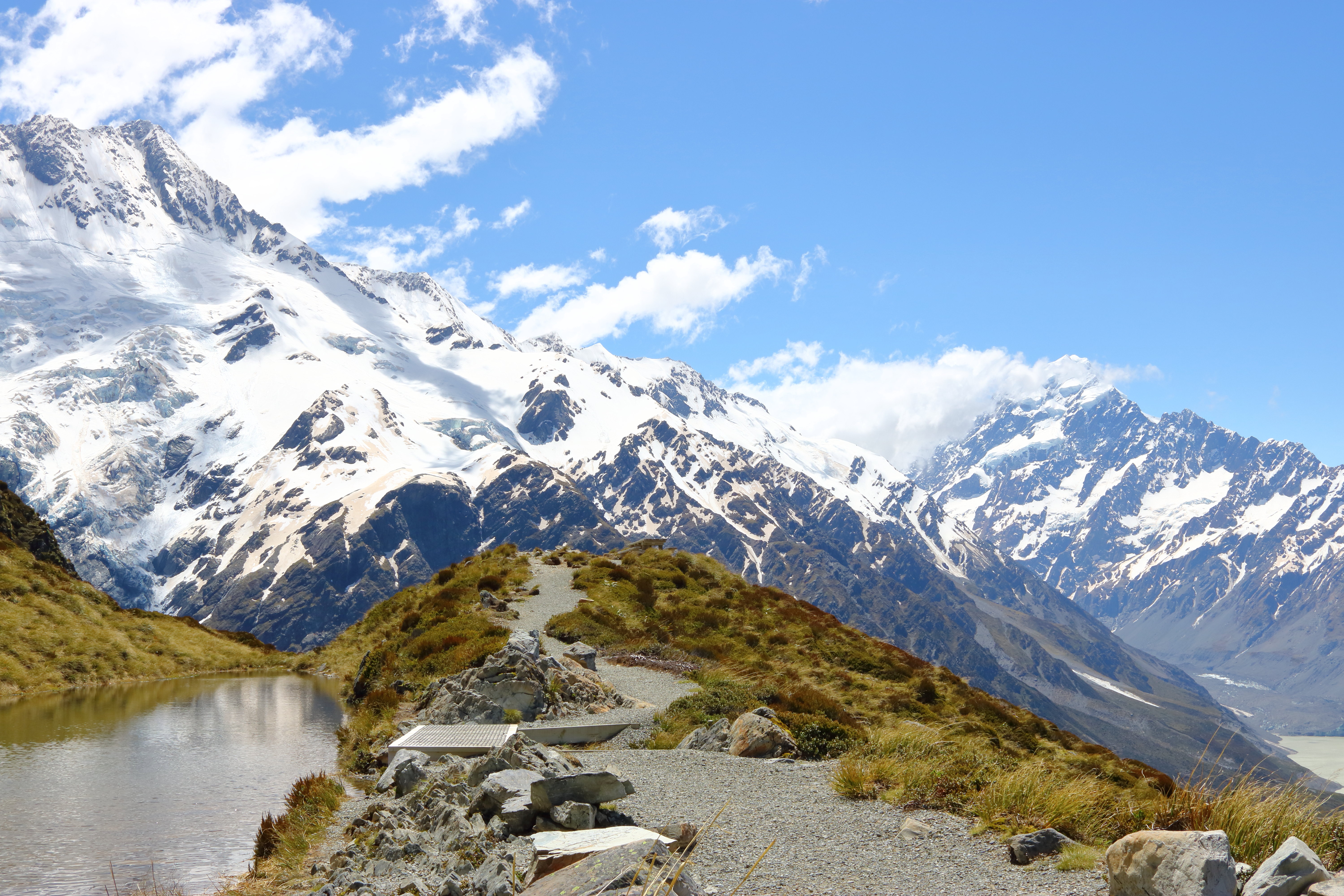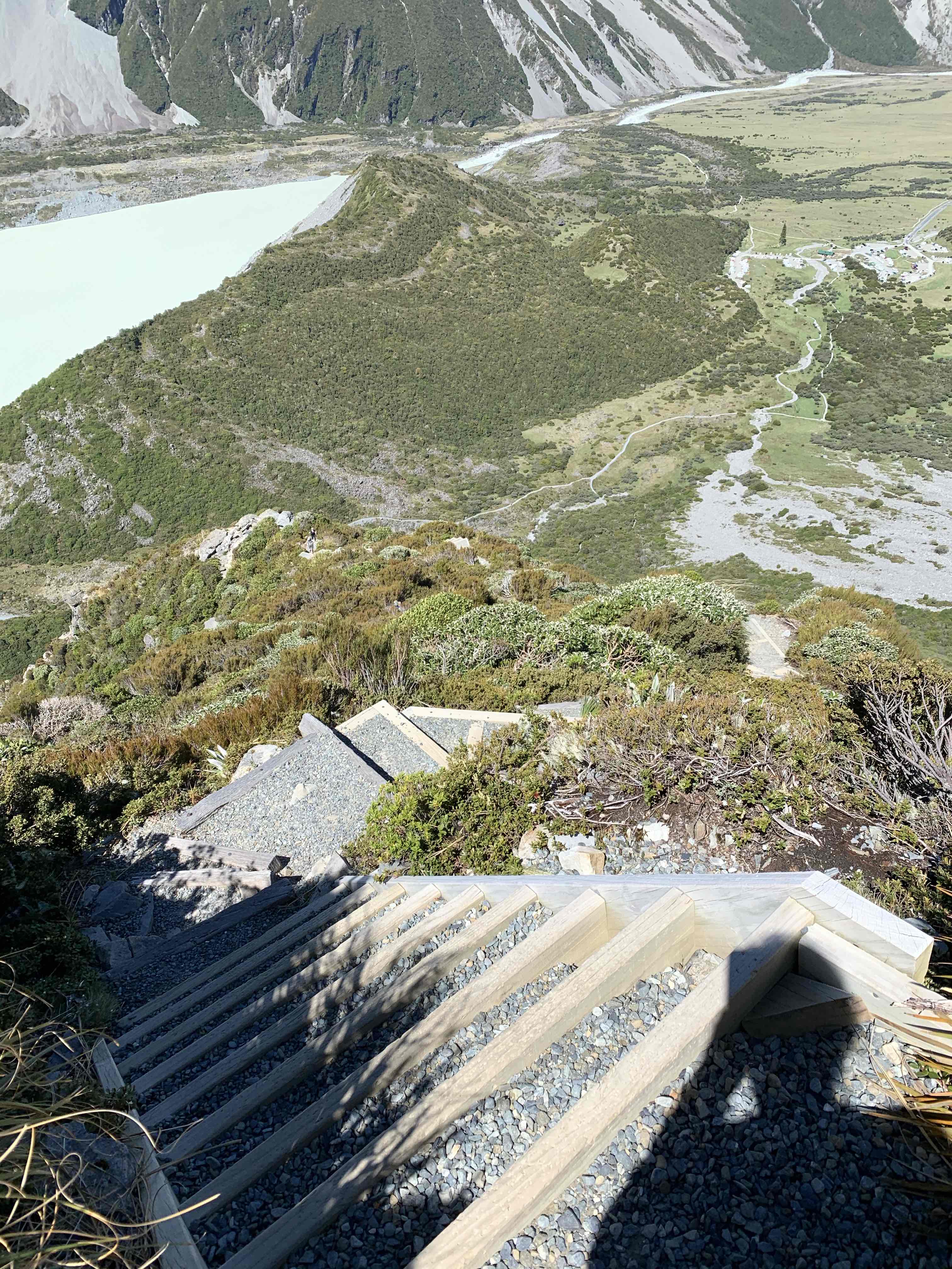 Am nächsten Tag hatten wir uns dann vorgenommen hoch in Richtung Mueller Hut zu gehen und die Aussicht von oben zu genießen. Leider hat es am Morgen noch geregnet, weshalb wir erst am späten Vormittag loskonnten. Dann ging es aber gleich ein paar hundert Meter hoch, insgesamt führen 2.000 Treppenstufen nach oben – was für ein tolles Training für die Beine… Auf die Höhe sind wir also recht schnell gekommen und je höher wir kamen umso mehr ist es aufgeklart und wir hatten eine wunderbare Sicht auf das gesamte Tal und den Mount Cook!