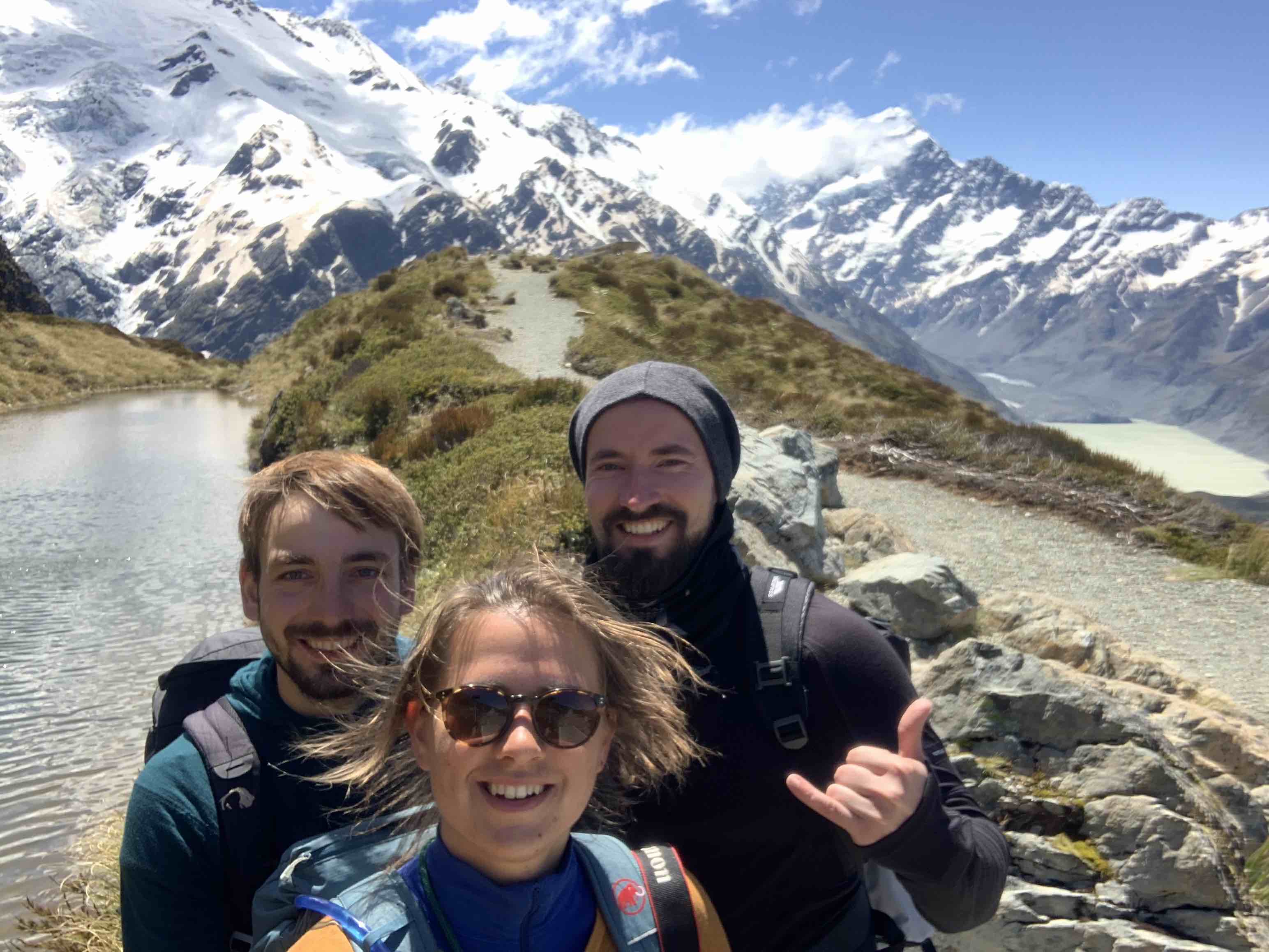 Hier haben wir auch das zweite Mal auf unserer Reise Besuch bekommen und Björn ist zu uns gestoßen. Nach einem Grillfest zur Feier sind wir dann gemeinsam weitergezogen in Richtung Mount Cook, dem höchsten Berg Neuseelands. Natürlich gibt es dort auch einige Wanderwege, von denen wir uns schon zwei herausgesucht haben und beide starteten direkt von unserem Campingplatz am Fuße der Berge. Der erste Tag war leider etwas bewölkt, sodass wir den kürzeren Weg ins Hooker Valley zuerst genommen haben. Er führte über ein paar Schwingbrücken zu einem Aussichtspunkt am Gletschersee am Fuß des Mount Cook, wo es gleich ziemlich windig und kalt wurde. Der Berg, bzw. die Spitze war immer nur spärlich zu sehen und war größtenteils wolkenverhangen.