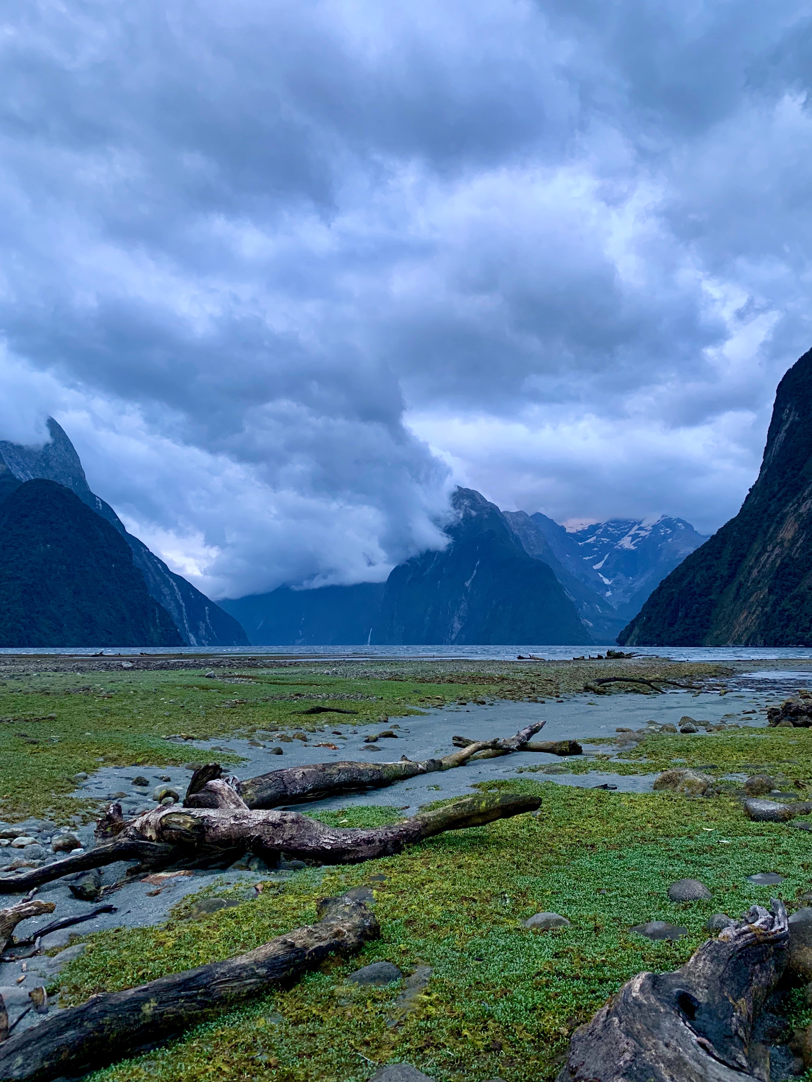 Im Vorfeld hatten wir schon gesehen, dass es in Milford Sound direkt nur einen Campground gibt und der nächste mindestens 45 Minuten entfernt ist vom Sound und wir somit den ganzen Weg wieder zurückfahren müssten. Wir hatten allerdings Glück, beim ersten Mal nachfragen wurden wir zwar abgewiesen, beim zweiten Mal hatten wir aber eine freundliche Rezeptionistin, die nochmal genauer nachgeschaut hat und uns schmale Stellplätze gegeben hat, sodass wir doch konnten direkt am Sound campen konnten. Zum Sonnenuntergang sind wir ans Wasser gegangen und hatten die Hoffnung, dass wir die Sonne im Fjord selbst sehen können. Die Sonne war dort leider nicht zu sehen, aber der Fjord, der immer dunkler wurde und über den die Wolken schnell hinweggezogen sind, sah fast ein wenig mystisch aus.