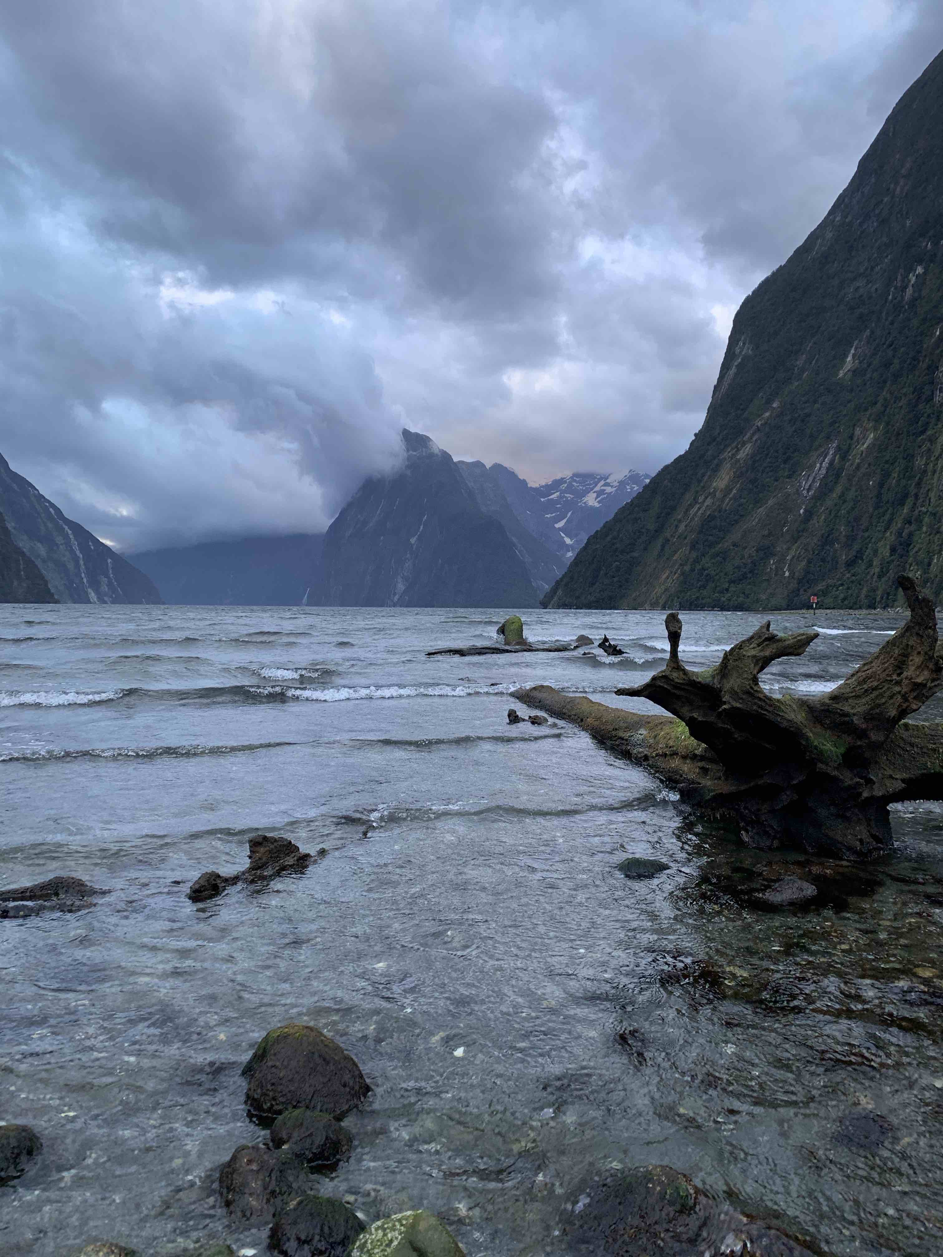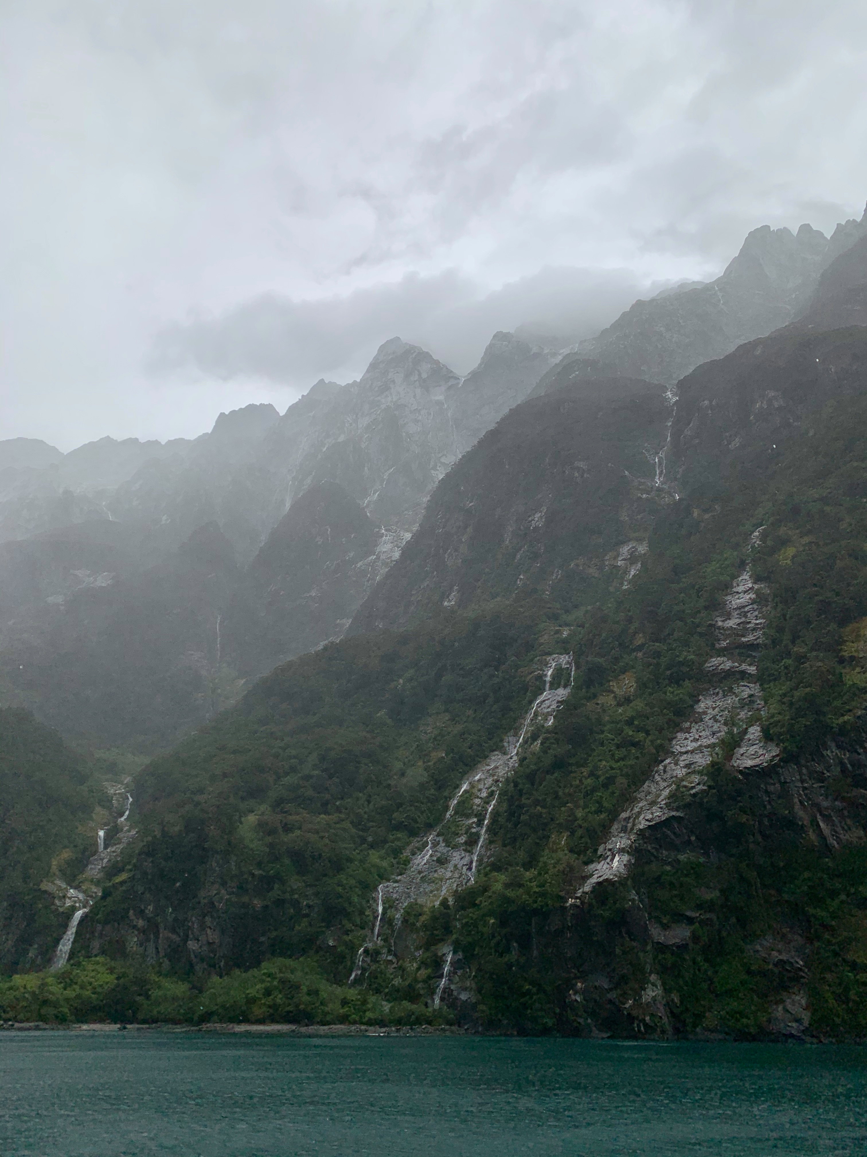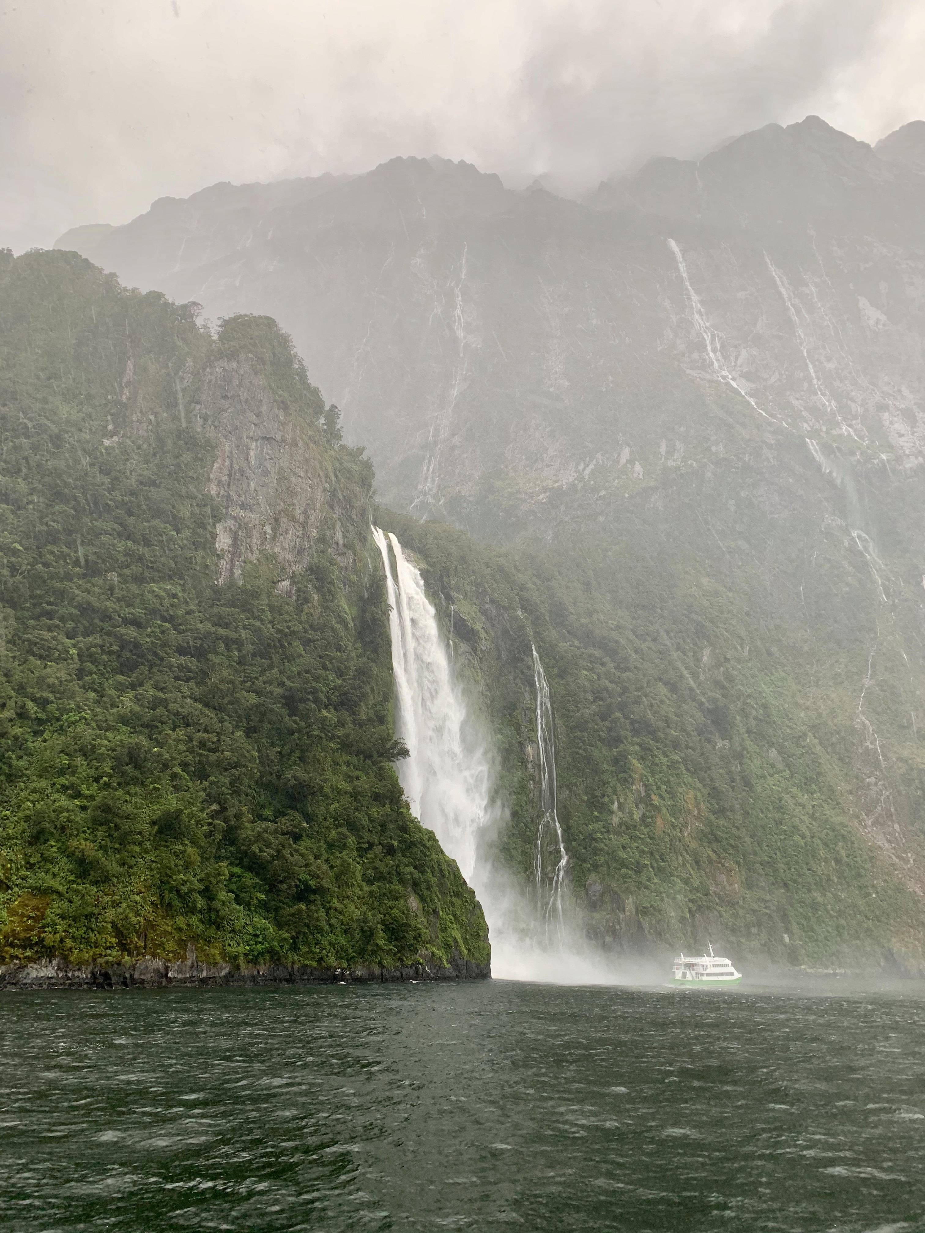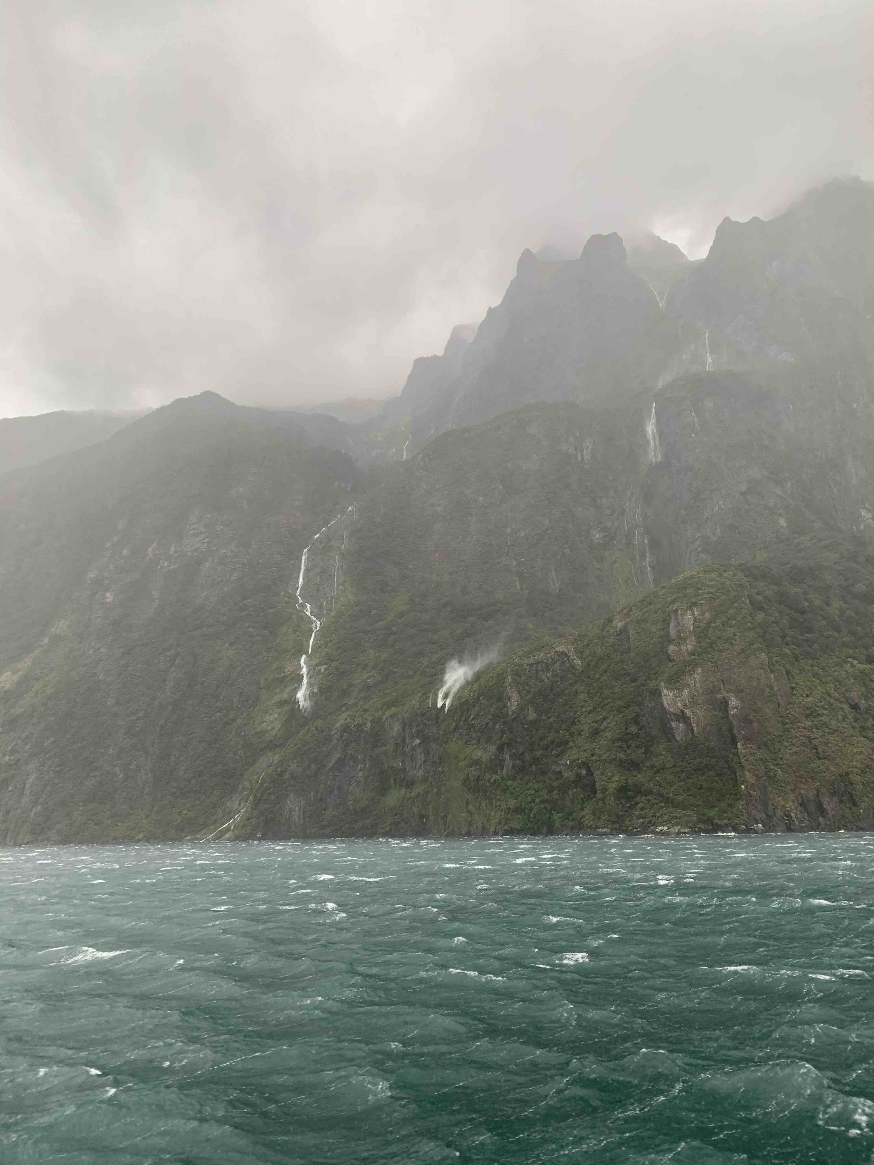 Am nächsten Morgen sind wir mit dem ersten Boot raus aufs Wasser gefahren um uns die Berge und die vielen Wasserfälle aus der Nähe anzuschauen. Wo wir am ersten Tag so Glück hatten mit dem Sonnenschein, hat es direkt morgens angefangen zu regnen und nicht mehr aufgehört, bis wir am Nachmittag wieder in Te Anau waren. Der Fjord sah im Regen allerdings wahnsinnig schön aus, überall waren Wasserfälle zu sehen, die teilweise in der Mitte abgebrochen sind, weil das Wasser vom starken Wind weggeweht wurde. Immer, wenn wir für ein paar Minuten rausgegangen sind aufs Deck, sind wir komplett durchnässt vom Regen und Wind, aber die Ansicht der Berge war einfach zu schön um sie nur vom Inneren des Boots zu sehen. Ein gutes hatte der starke Regen auf jeden Fall – so viele Wasserfälle sind nur bei Regen zu sehen. 🙂