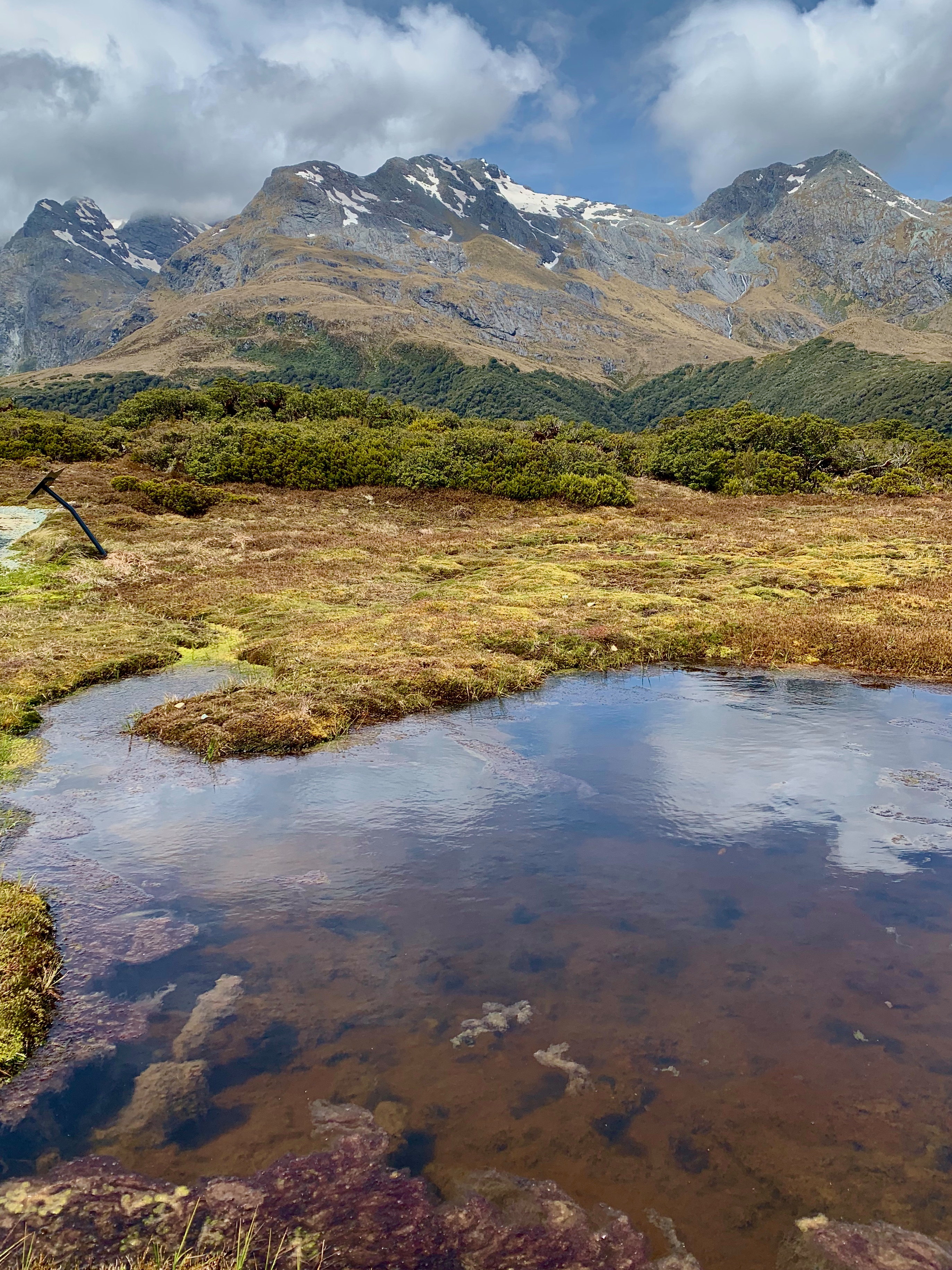 Wir sind also zusammen weiter gefahren und mit ein paar Stopps an Stränden und am südlichsten Punkt der Südinsel Neuseelands, wo sogar eine kleine Leuchtsäule steht (Leuchtturm kann man es nicht wirklich nennen…) ging es in Richtung Milford Sound. Nach einer Zwischenübernachtung ging es mit vielen Pausen zum Milford Sound – der einzige Weg führt von Te Anau dorthin und es ist eine kilometerlange Sackgasse, aber die verschiedenen Ausblicke auf die Wiesen und Berge sind einfach wunderbar. Die Aussicht haben wir das ein oder andere Mal genossen und hatten sogar Glück, dass die Sonne schien. Natürlich haben wir uns auch noch eine kurze Wanderung herausgesucht um die Berge von einem höheren Punkt zu betrachten und sind den Key Summit Track gegangen. Der Track ging nicht allzu hoch, aber die Aussicht auf das langgezogene Tal war wirklich schön.
