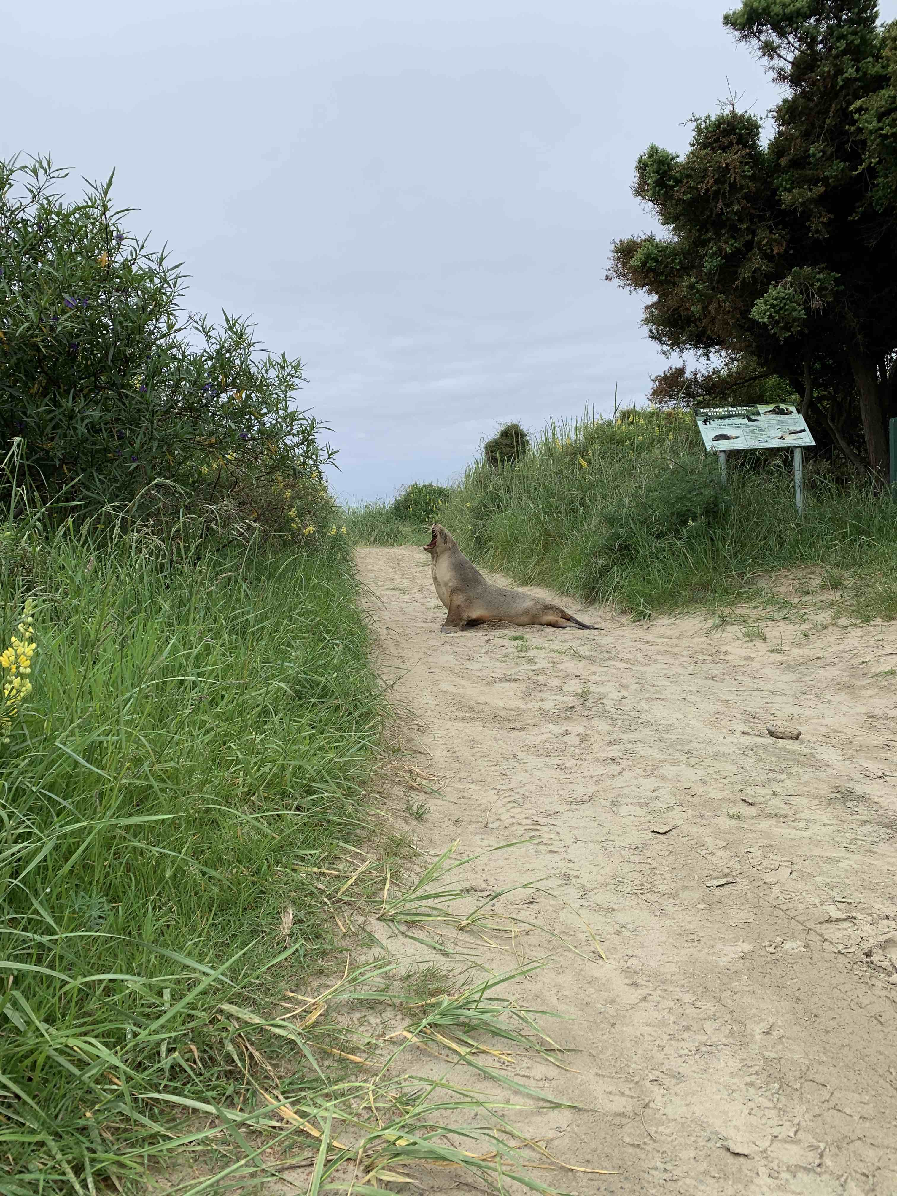 Nachdem wir noch etwas Zeit in der Innenstadt verbracht haben, uns mit neuer Ausrüstung ausgestattet haben für die nächsten Wanderungen und einen richtig guten Burger gegessen haben, sind wir aufgebrochen zu den Catlins. Dort gibt es viele verschiedene interessante Orte und wir haben dort viele kleine Ausflüge gemacht, z.B. zu einem Leuchtturm und zu verschiedenen Wasserfällen, zu denen man nach kurzen Wanderungen durch den Wald gelangt. Das Highlight war aber der Cannibal Beach, an dem wir 3 Seelöwen gesehen haben. Der erste hat in der Böschung geschlafen und den nächsten haben wir am anderen Ende des Strandes gesehen. Der war schon wach und hat uns eine richtige Show geboten, als er aus dem Wasser heraus ist und langsam den Strand hinauf gerobbt ist und sich von der besten Seite gezeigt hat. Über ihn haben wir uns schon richtig gefreut und als wir dann zurück zu den Autos gegangen sind, lag ein Seelöwe quer über den Weg und hat uns sogar recht nah rangelassen.